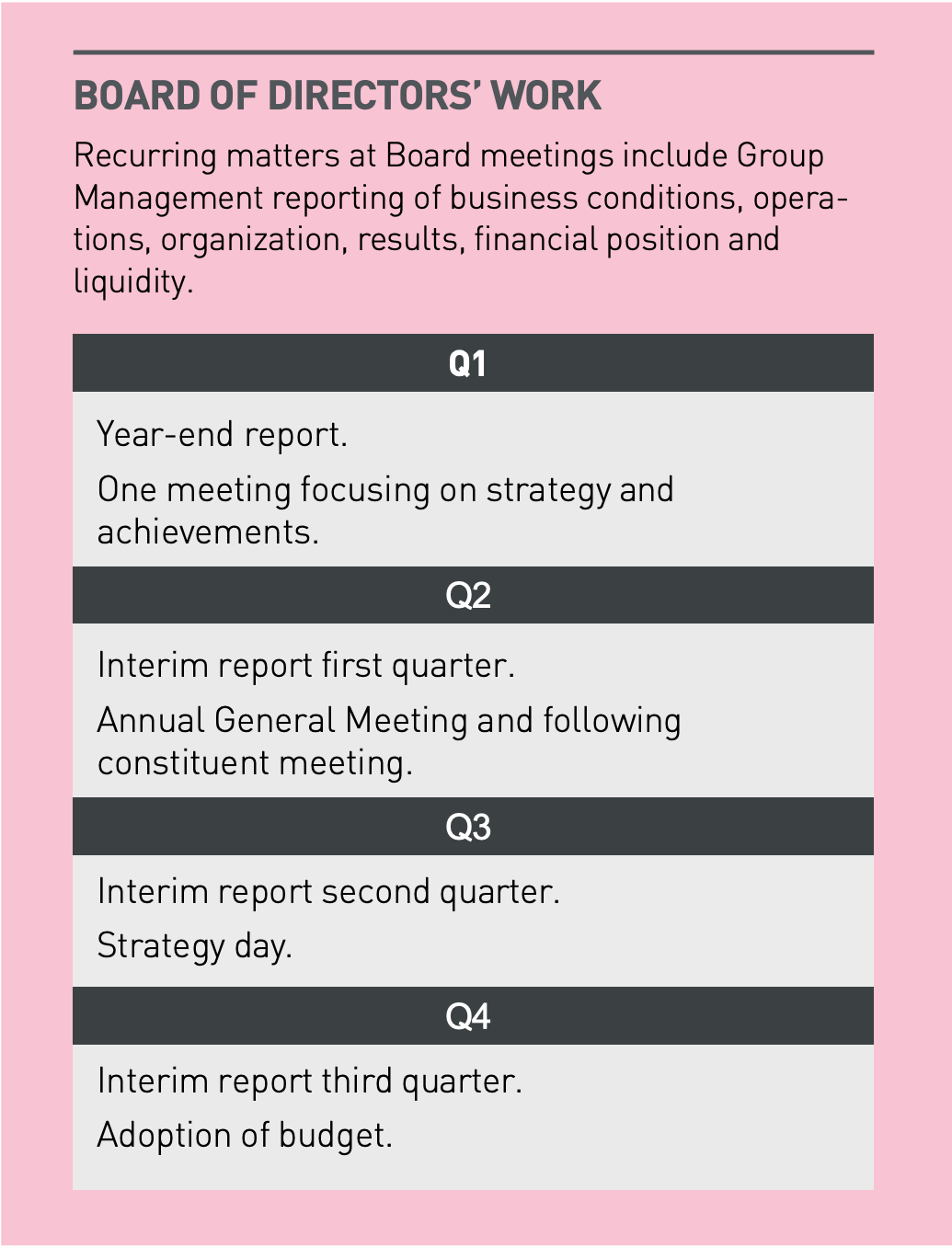 In 2024, there were 29 Board meetings. Scheduled agenda items at Board meetings during the year are Group Management’s reporting of business conditions, operations, organizational resources, results of operations, financial position and liquidity. Special Board meetings with a focus on strategy are held in the spring and autumn. During the autumn, and before Christmas, Board meetings consider the budget and business plan for the following year.