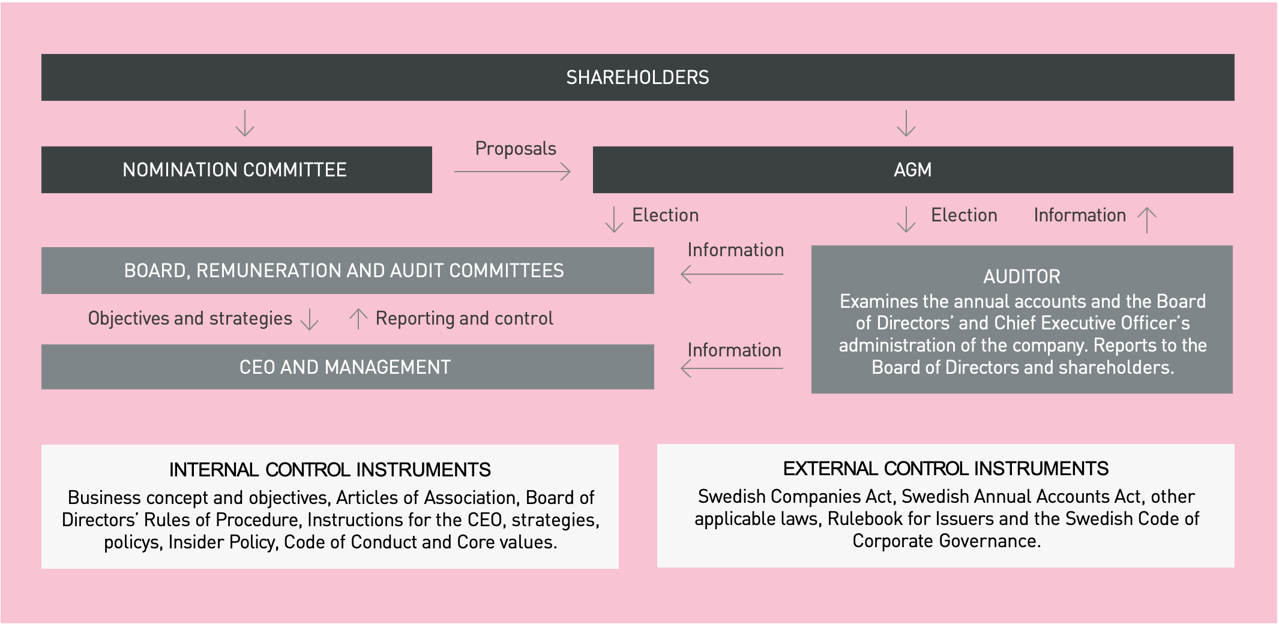 The shareholders exercise their influence at the General Meeting, which is the company’s chief decision-making body. Responsibility for the company’s organization and administration of the company’s affairs rests with the Board of Directors and the CEO in accordance with applicable laws and regulations, and the Board of Directors’ internal control instruments.