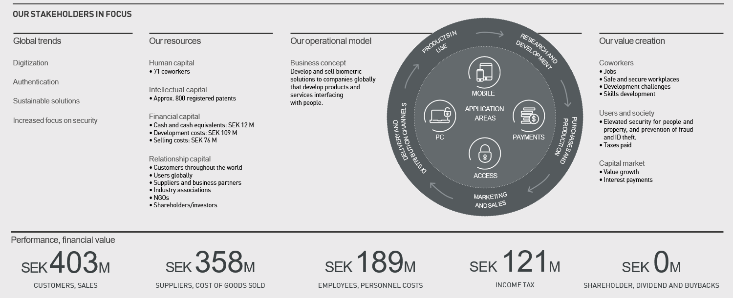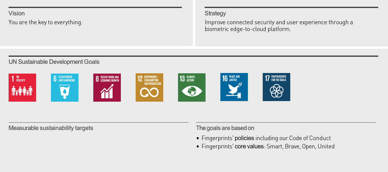 Fingerprints’ materiality analysis forms the foundation for our sustainability targets. Our targets are aligned with the UN SDGs. The Global Reporting Initiative (GRI) and stipulations of the Swedish Annual Accounts Act on non-financial information (Ch. 6 Sect. 10) have served as the starting point for producing our materiality analysis, which is integrated into the company’s overall risk-management process.