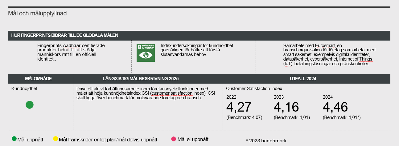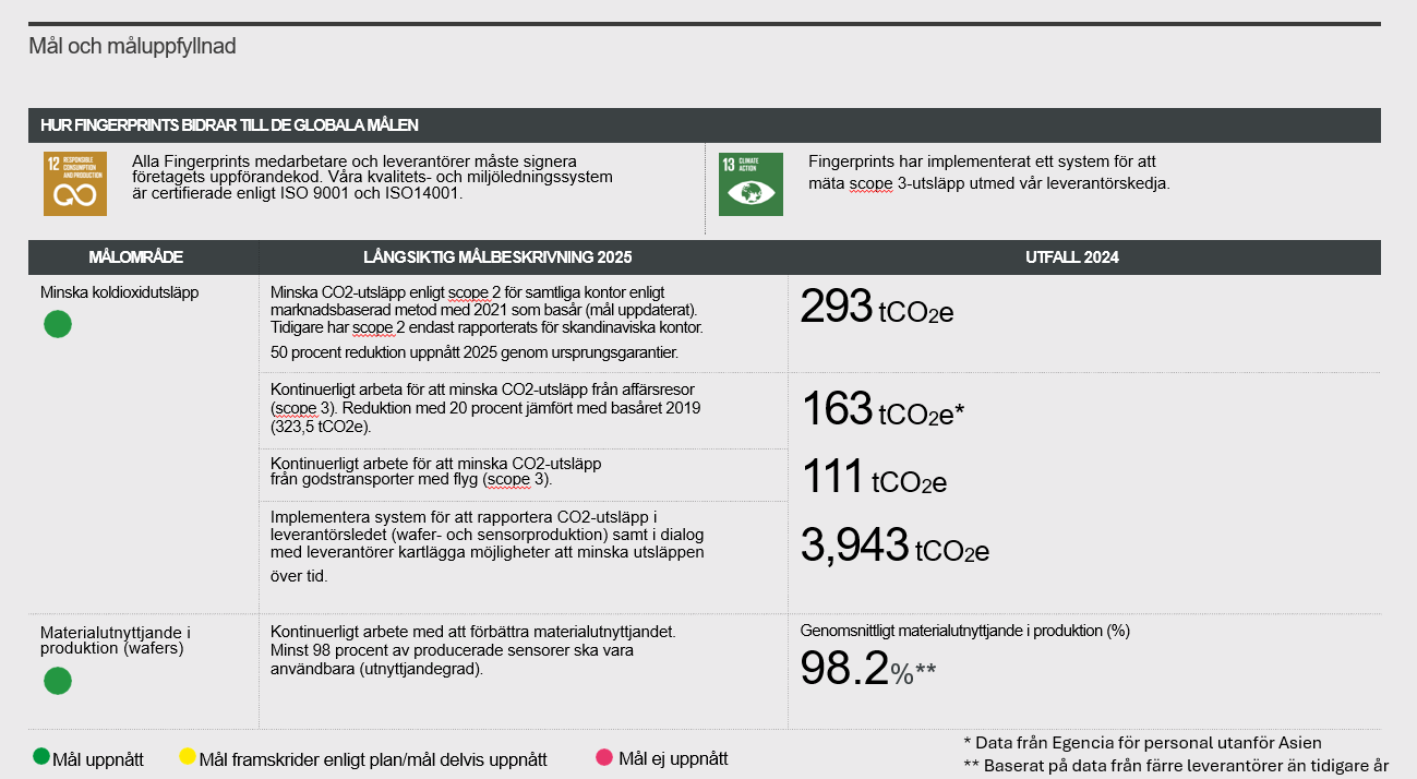 Som en följd av Fingerprints beslut att avveckla produktgrupperna Mobile och PC minskade antalet levererade sensorer avsevärt under 2024 jämfört med 2023. Detta är den främsta orsaken till den minskning av Scope 3-utsläpp som rapporteras för 2024. Vår strategi framåt inkluderar ett viktigt mål att öka andelen mjukvara i vår intäktsmix. Denna omställning förväntas bidra till en ytterligare minskning av växthusgasutsläpp, eftersom mjukvarulösningar generellt har en lägre miljöpåverkan än tillverkning och distribution av hårdvara.
