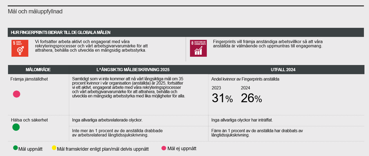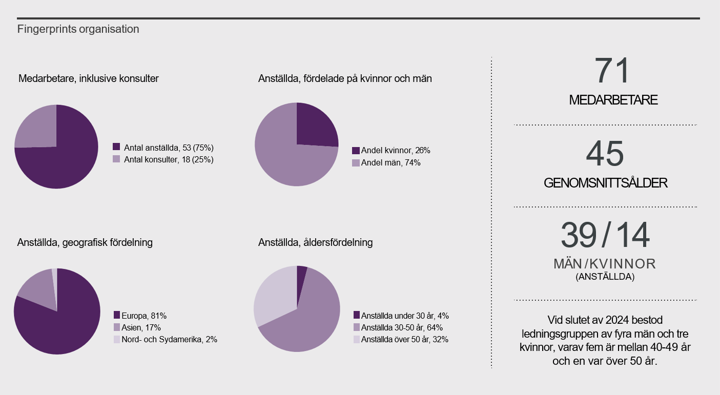På Fingerprints lägger vi stor vikt vid att följa upp hur våra medarbetare mår och vi arbetar aktivt med att skapa bästa möjliga förutsättningar för välmående och enga¬gemang. Under ett antal år har Fingerprints genomfört veckovisa pulsmätningar med all personal med fokus på hur våra medarbetare mår och hur de uppfattar sin arbetssituation. Ett omfattande kostnadsoptimeringsprogram implementerades dock under 2024, innefattande genomgripande organisationsförändringar som ledde till att ett betydande antal av våra medarbetare lämnade Fingerprints.